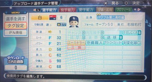 オリジナル選手、白千尋選手。 足はそんなに速くないけど守備がめちゃくちゃ良い選手を作りたかったのでこんな感じに。 正直肩力と捕球はもうちょっと高くしたかったけどそれはやっぱりパワ二ブランド。 なかなかうまくいかない。 守備の名手を是非。 パワナ…